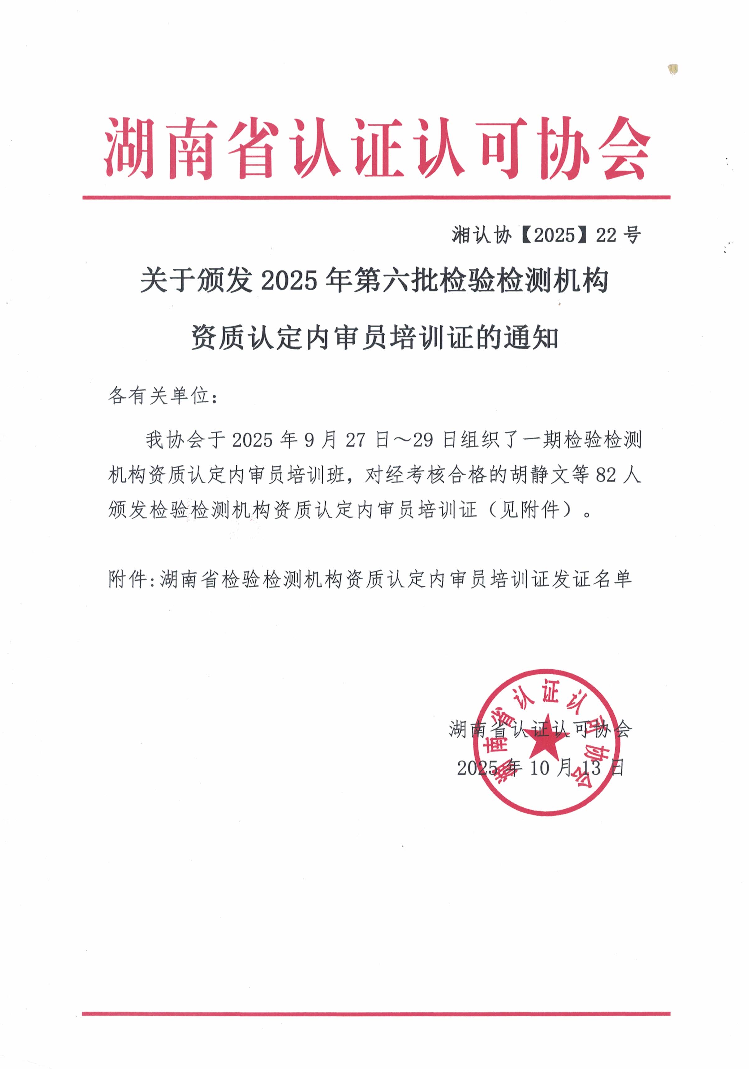 关于颁发2025年第六批检验检测机构资质认定内审员培训证的通知
