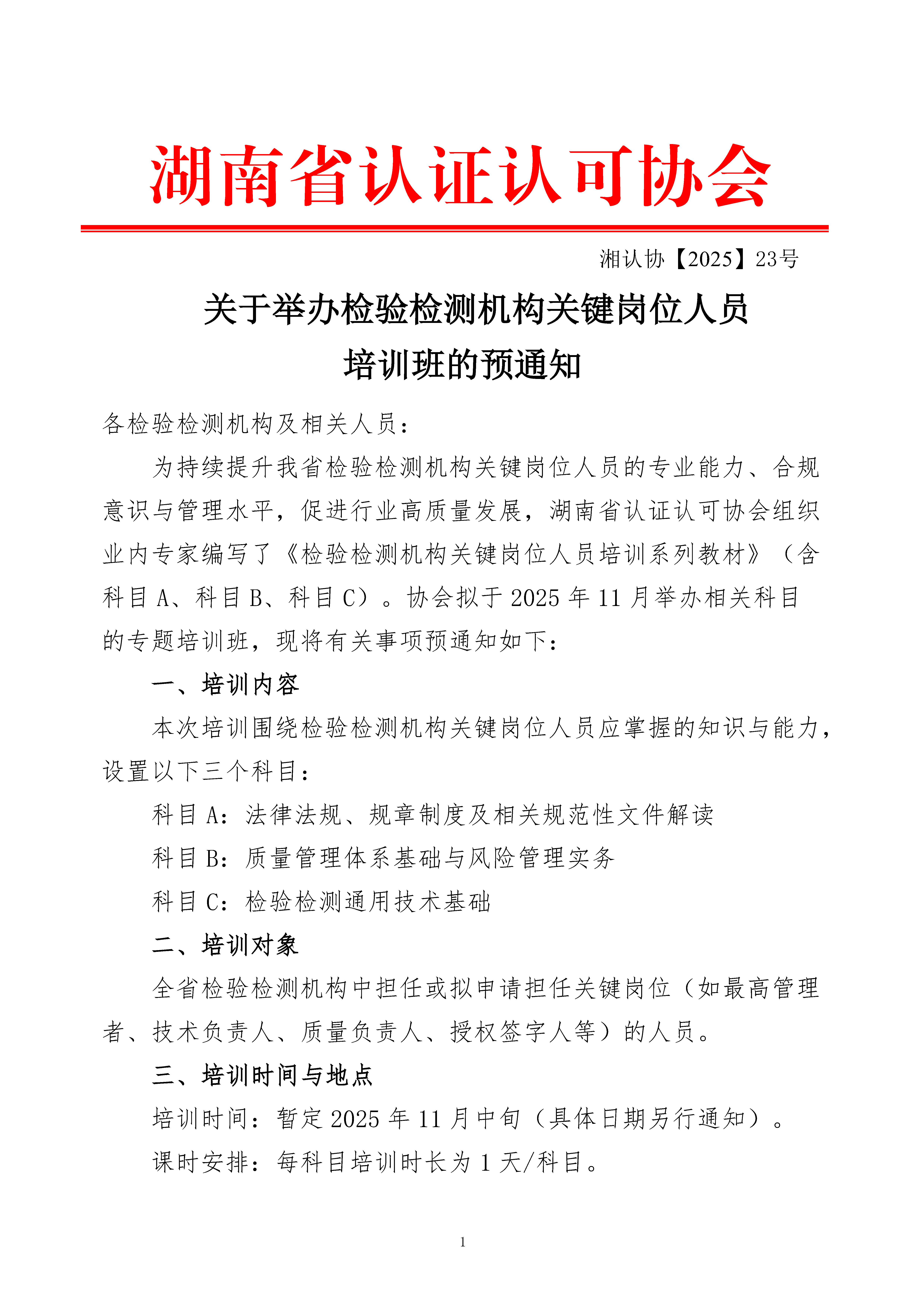 关于举办检验检测机构关键岗位人员培训班的预通知
